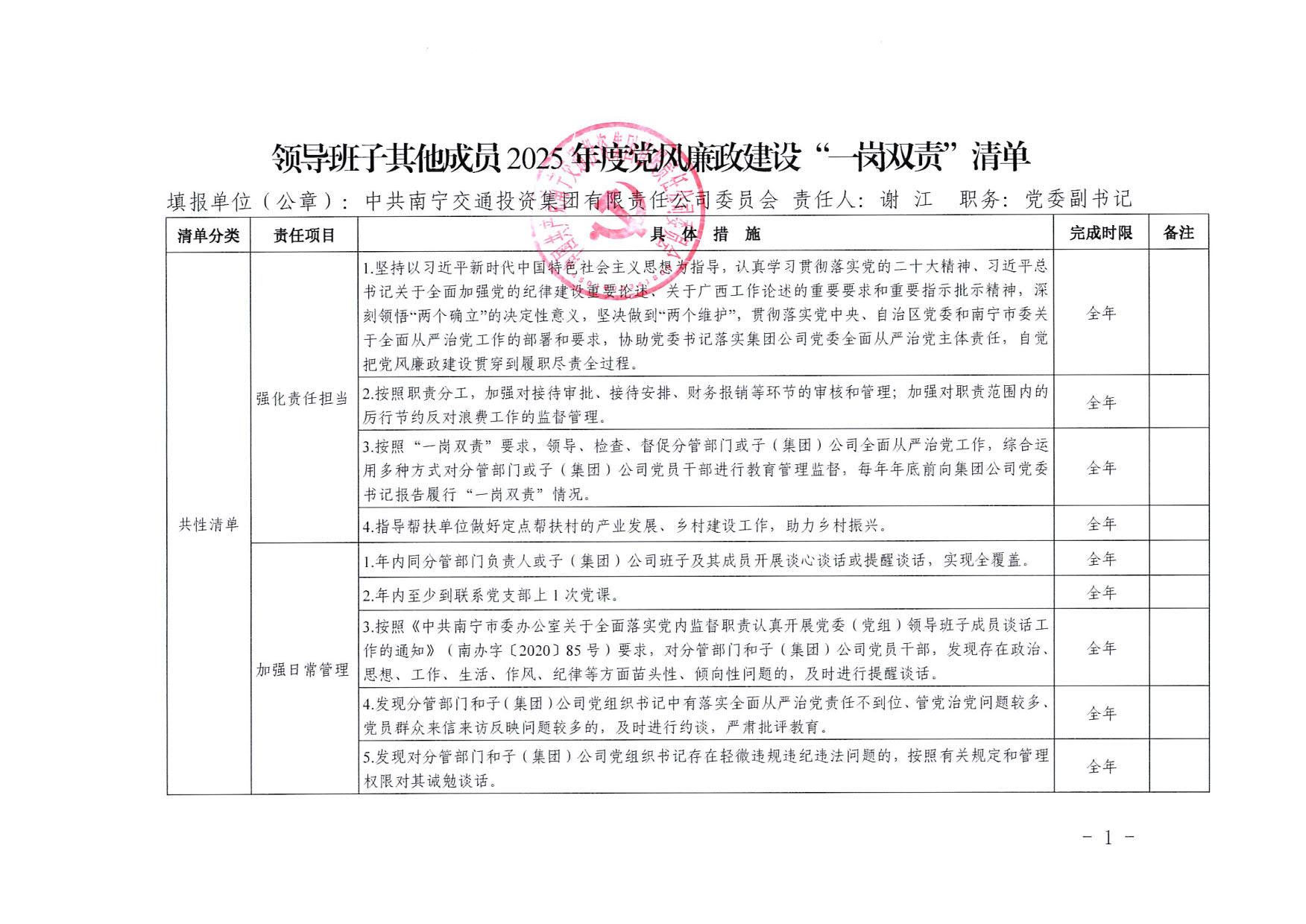 南寧交投集團領導班子其他成員2025年度黨風廉政建設“一崗雙責”清單(一)