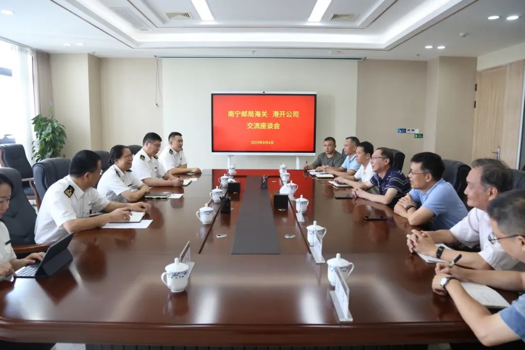 南寧郵局海關(guān)副關(guān)長李良、余泳,南寧交投集團副總經(jīng)理、港開公司副董事長周宏,港開公司副總經(jīng)理藍澄、陳志杰及雙方有關(guān)部門負責(zé)人參加座談。(港開公司 覃燕春)